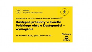 Zapraszamy do udziału w webinarium z cyklu „PFRON wspiera dostępność” pn.: „Dostępne produkty w świetle Polskiego Aktu o Dostępności – wymagania”, które odbędzie się 11 września 2025 r. o godzinie 10.00 w formule on-line na platformie zoom. Spotkanie zostanie poświęcone Polskiemu Aktowi o Dostępności, podczas którego eksperci podzielą się wiedzą na temat różnych aspektów produktów objętych ustawą.